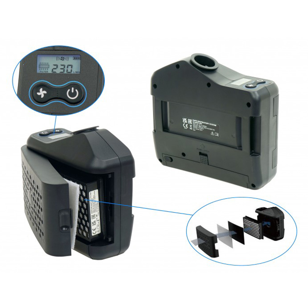 Der Akku des Frischluftsystems wird mit dem beiliegenden Ladegerät geladen. Der Akku kann gewechselt werden (Zusatz Akku Optional erhältlich), somit hat man keine Ausfallzeiten.