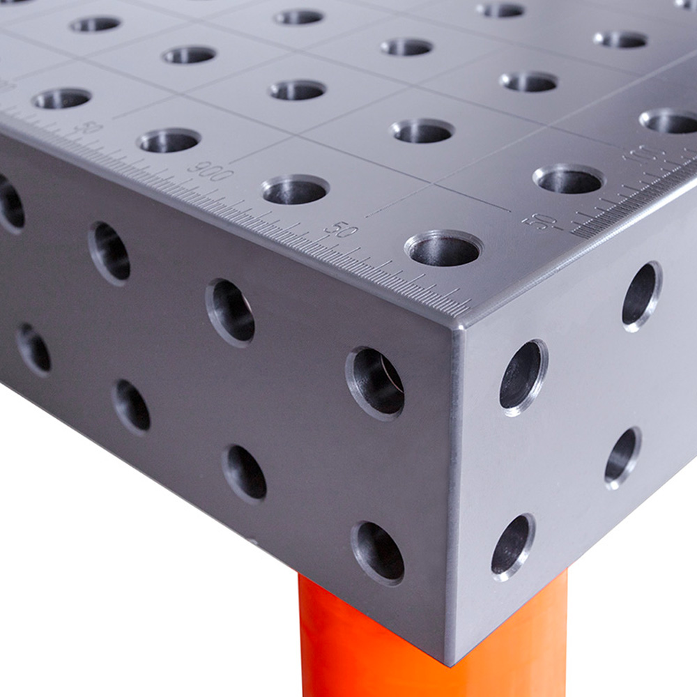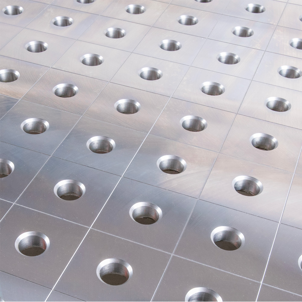 Die Arbeitsfläche ist mit präzise gebohrten und gefrästen Löchern von 16 mm Durchmesser versehen, die in einem regelmäßigen 50mm Raster angeordnet sind. Jedes Loch hat eine Toleranz von ±0,05 mm, der Lochabstand beträgt 50 mm.